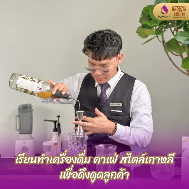 บาริสต้า บัดดี้เลือกใช้วัตถุดิบสำหรับการเรียนสอนทำเครื่องคาเฟ่สไตล์เกาหลีจากโพโมนา (Pomona) เพราะโพโมนาคือผู้ผลิตผลิตภัณฑ์จากเกาหลีที่ดีที่สุด ทุกเครื่องดื่มที่นำผลิตภัณฑ์ของโพโมนาไปใช้จะได้รสชาติอร่อยและเพิ่มสีสันให้กับเครื่องดื่มได้เป็นอย่างดี วัตถุดิบที่นำมาใช้ไม่ว่าจะเป็นใน ไซรัปมิกซ์โซโลจี้ ไซรัปกาแฟ ไซรัปผลไม้ ไซรัปชา ซอส สมูทตี้ ผงชงหรือผลิตภัณฑ์ตัวใหม่อย่าง Fruit Concentrate ทางโพโมนาก็เลือกวัตถุดิบที่สดใหม่และใช้ส่วนผสมจากธรรมชาติเท่านั้น และในทุกกระบวนการผลิตโพโมนาก็ผลิตด้วยกระบวนการอย่างพิถีพิถันเพื่อให้ทุกผลิตภัณฑ์ที่ได้มีคุณภาพ เสมือนส่งตรงออกจากสวนผลไม้ ไม่ใช้สารกันบูดเพราะนอกจากโพโมนาจะคำนึงถึงรสชาติและคุณภาพแล้ว โพโมนายังคำนึงถึงสุขภาพของผู้บริโภคอีกด้วย ดังนั้นหากคาเฟ่หรือร้านกาแฟที่ได้สูตรทำเครื่องดื่มที่ใช้ผลิตภัณฑ์จากโพโมนาไป ทางบาริสต้า บัดดี้รับรองได้เลยว่าคุณภาพ ปริมาณ คุ้มค่ากับราคาที่จ่ายไปอย่างแน่นอน แถมรสชาติที่ได้ก็อร่อยเหมือนมีมืออาชีพมาชงเอง และหน้าตา สีสันที่ได้ก็โดดเด่นจนเป็นที่น่าจับตามองอย่างแน่นอน