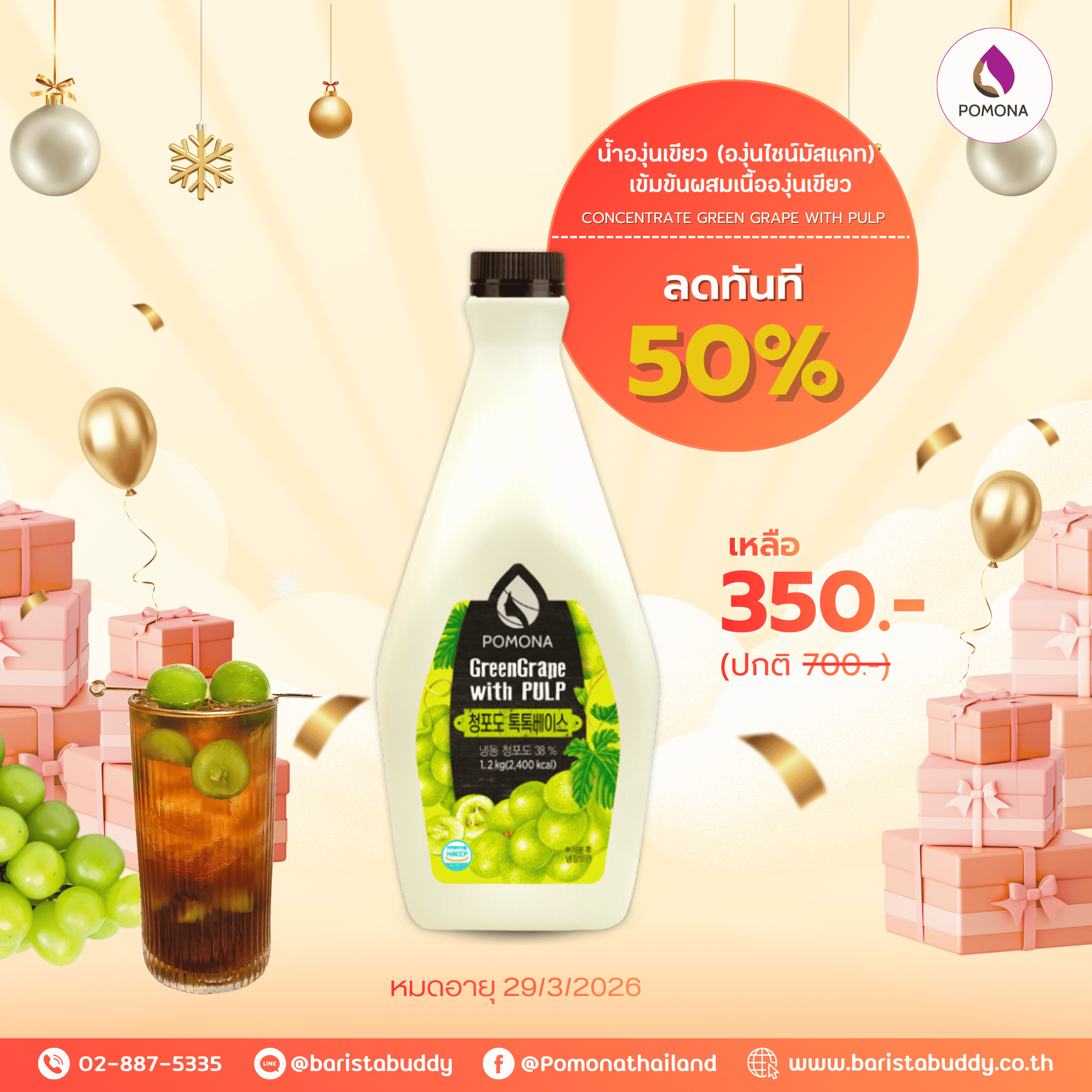• น้ำองุ่นเขียว (องุ่นไชน์มัสแคท) เข้มข้น ผสมเนื้อองุ่นเขียว ลด 50% เหลือเพียง 350.- (ปกติ 700.-) และแถมฟรี! สูตร 5 เมนู