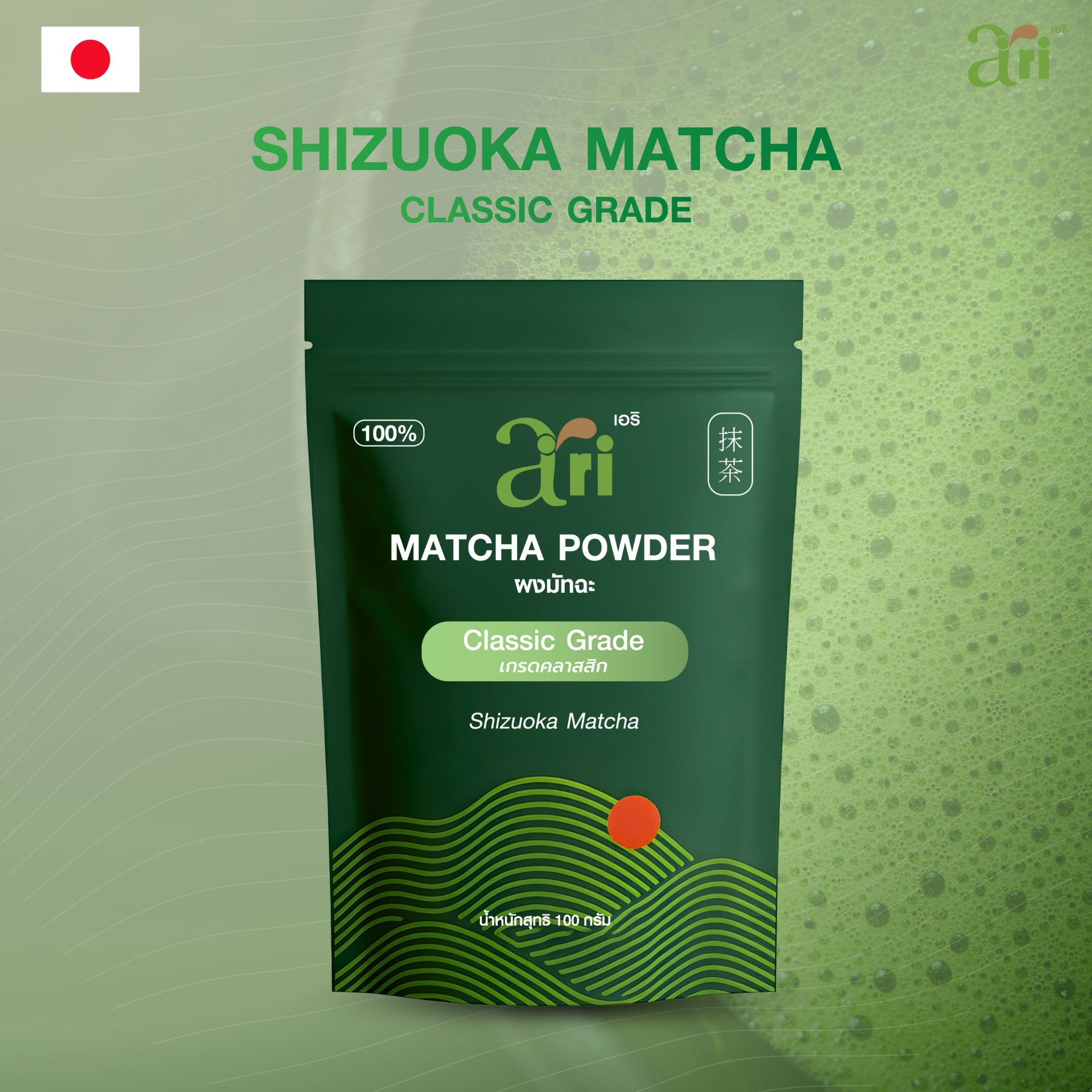 Ari ผงมัทฉะ เกรดคลาสสิก จากเมืองชิซุโอกะ ประเทศญี่ปุ่น โทนสาหร่าย 100 กรัม